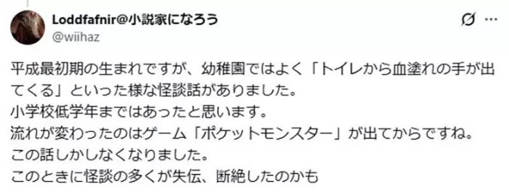 很快就有网友回忆:自己是90年代初出生的,幼儿园时还会听到“马桶里伸出血手”的怪谈;小学低年级也还有类似传闻;但自从《宝可梦》出现之后,话题突然就被统一成了宝可梦。什么花子、人体模型、旧校舍传说,像是被集体遗忘了一样。