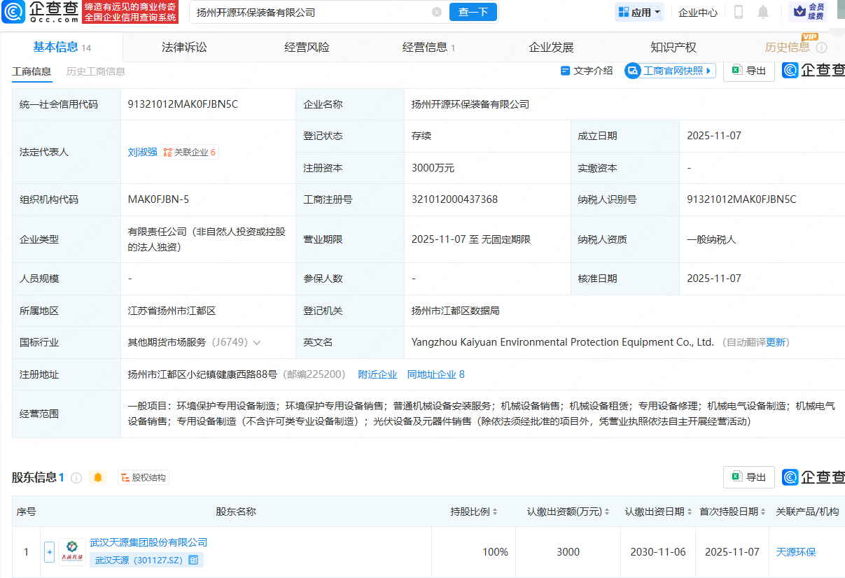近日,扬州开源环保装备有限公司成立,法定代表人为刘淑强恒盛优配,注册资本为3000万元,经营范围包含:环境保护专用设备制造;普通机械设备安装服务;机械设备租赁;专用设备修理等。企查查股权穿透显示,该公司由武汉天源(301127)全资持股。